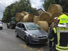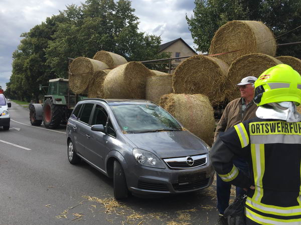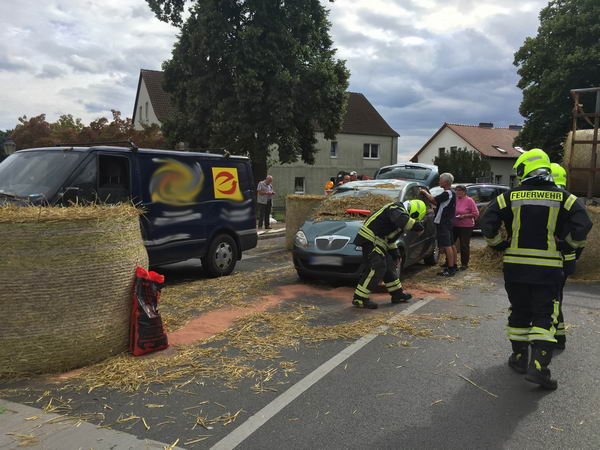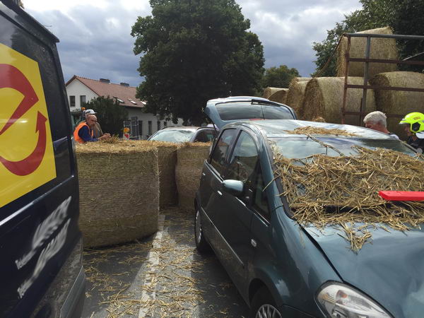 Ein Gespann aus Trecker und Anhänger verlor in der Kurve 6 große Strohballen. Die zwei Pkw wurden erheblich beschädigt und der Transporter bekam auch Blechschäden Die am Unfall beteiligten Personen sind mit einen großen Schreck davon gekommen.